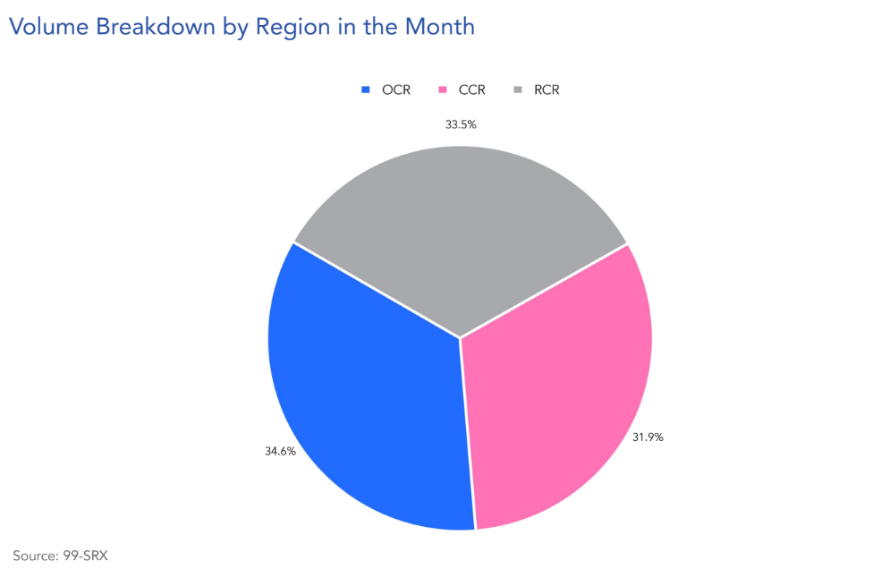 Breaking it down by region, in August 2025, 34.6% of the total condo rental volume was from Outside Central Region (OCR), 33.5% from Rest of Central Region (RCR), and 31.9% from the Core Central Region (CCR).