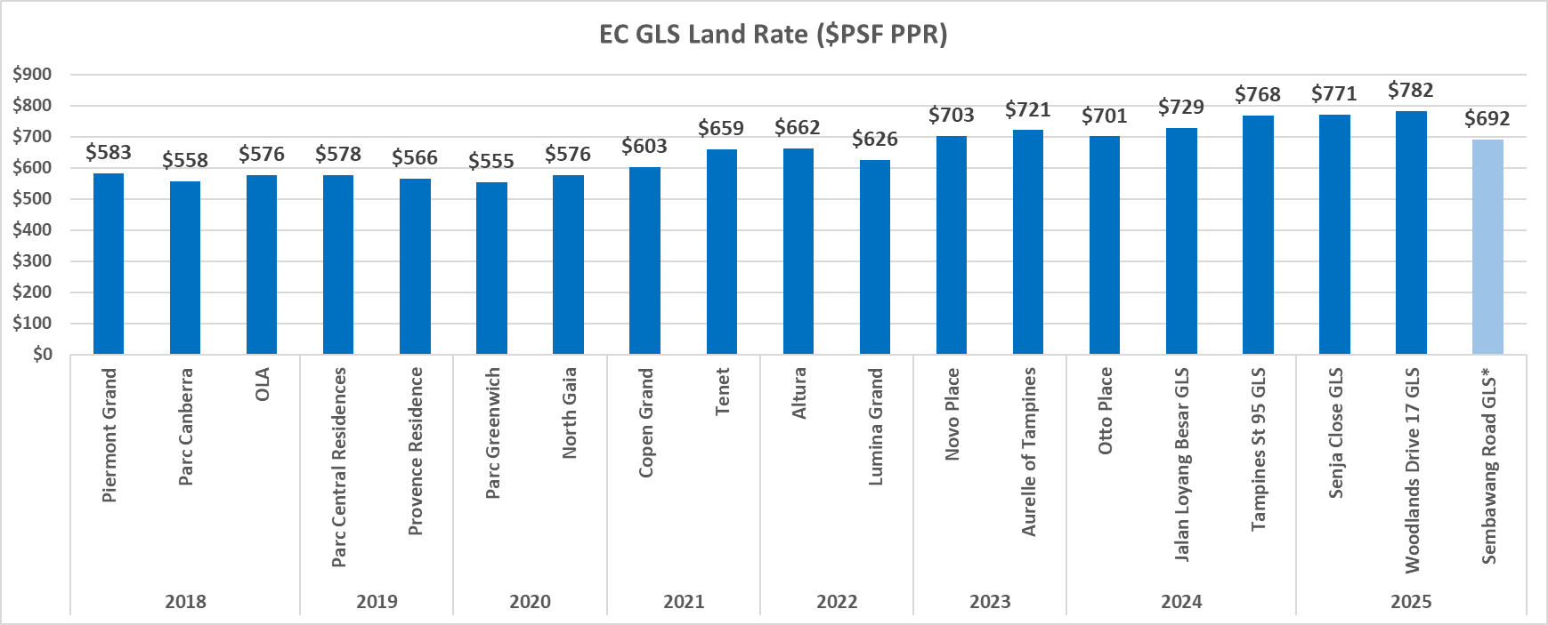 The tender outcome marked the first time since September 2022 that an EC GLS plot attracted a top bid below S$700 psf ppr. The last instance was at Bukit Batok’s Lumina Grand site, awarded to CDL at S$626 psf ppr. That project launched in January 2025 at an average of S$1,464 psf and achieved brisk sales.