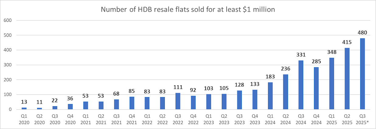 An estimated 480 resale flats were sold for at least S$1 million in Q3 2025, up from 415 in Q2. That brings the 9M 2025 tally to 1,243 such flats, already surpassing the full-year record of 1,035 in 2024. These sales made up around 6% of all resale transactions in the first nine months of this year.