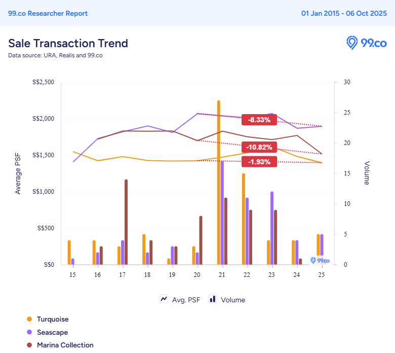 In terms of price psf, Turquoise is currently the lowest, hence the most affordable compared to its neighbours. Notably, the Marina Collection’s 2025 psf figure is based on a single transaction — a 3,272-sqft ground-floor unit was sold in July for S$4.95 million, resulting in a S$3.675 million loss.