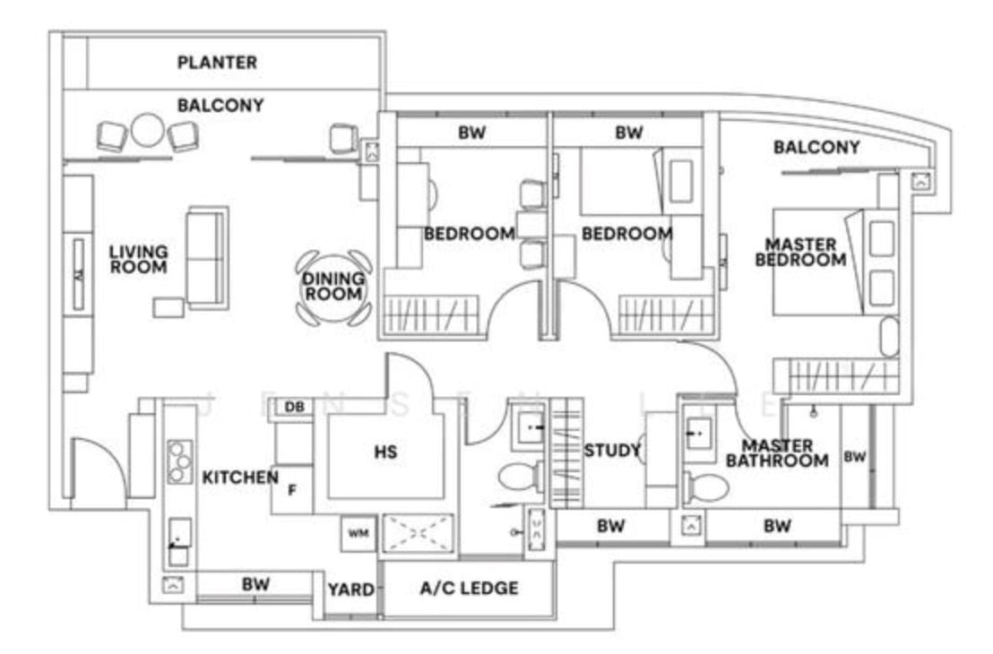 The layout of this particular 5-room unit comes with a slightly curved section in the main bedroom. However, this mainly affects the balcony zone rather than the internal bedroom area, so it is unlikely to be a major deal-breaker for most buyers.