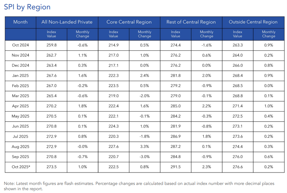 Resale condo prices continued to strengthen in October. The price Index rose by 1% month-on-month, from 270.8 in September to 273.5 in October. On a year-on-year basis, prices were up 5.3% compared to October 2024.