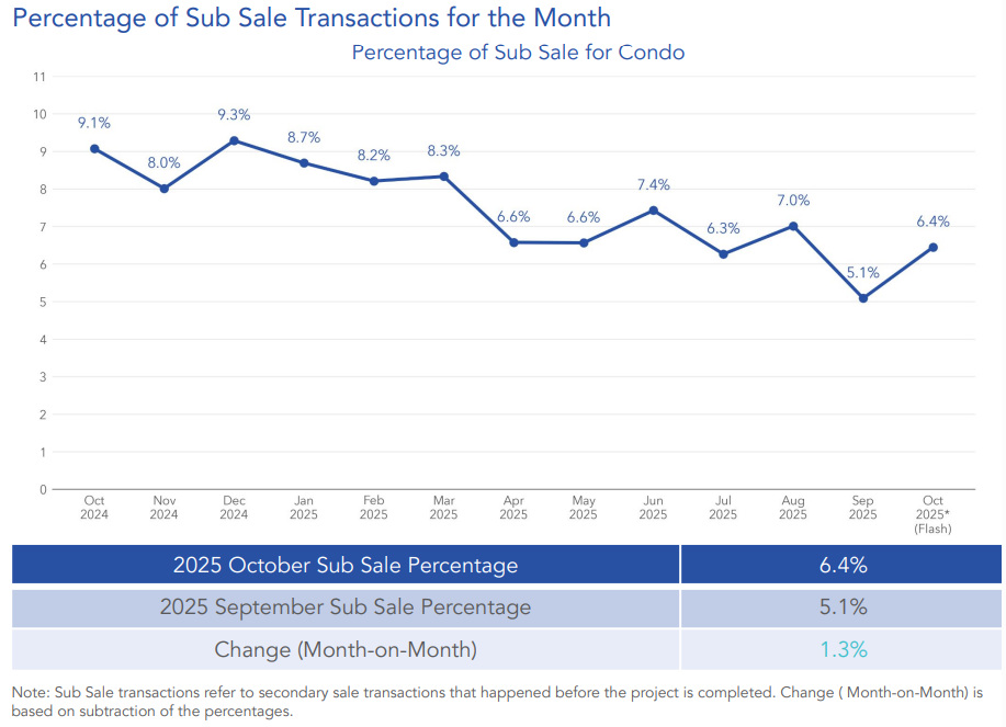 Sub-sale transactions, which refer to secondary sales before project completion, made up 6.4% of all secondary sale transactions in October. This was up from 5.1% in September, representing a 1.3% increase month-on-month. While still a relatively small share of the market, the rising sub-sale proportion may reflect growing confidence, especially amid rising new launch prices and improving resale valuations.