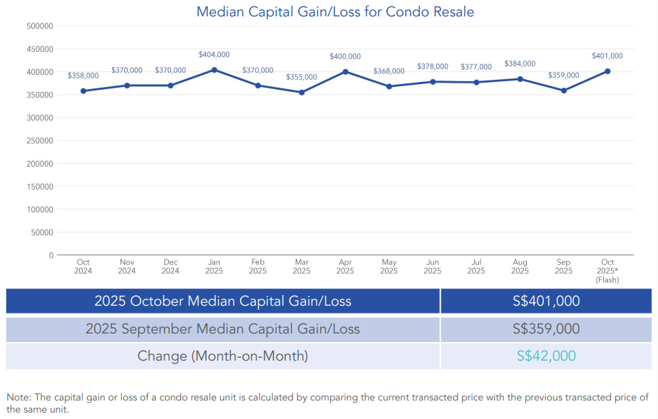 Resale condo sellers continued to enjoy healthy price outcomes in October. The overall median capital gain stood at S$401,000, up from S$359,000 in September, representing a month-on-month increase of S$42,000