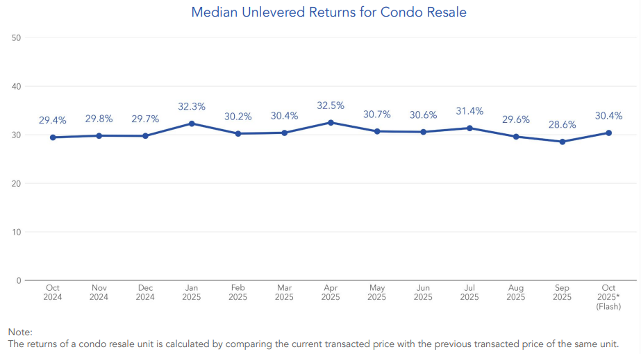 In terms of unlevered returns, which compare current resale prices to previous purchase prices without considering financing, the overall median return reached 30.4% in October. This points to sustained long-term price appreciation for many condo owners.