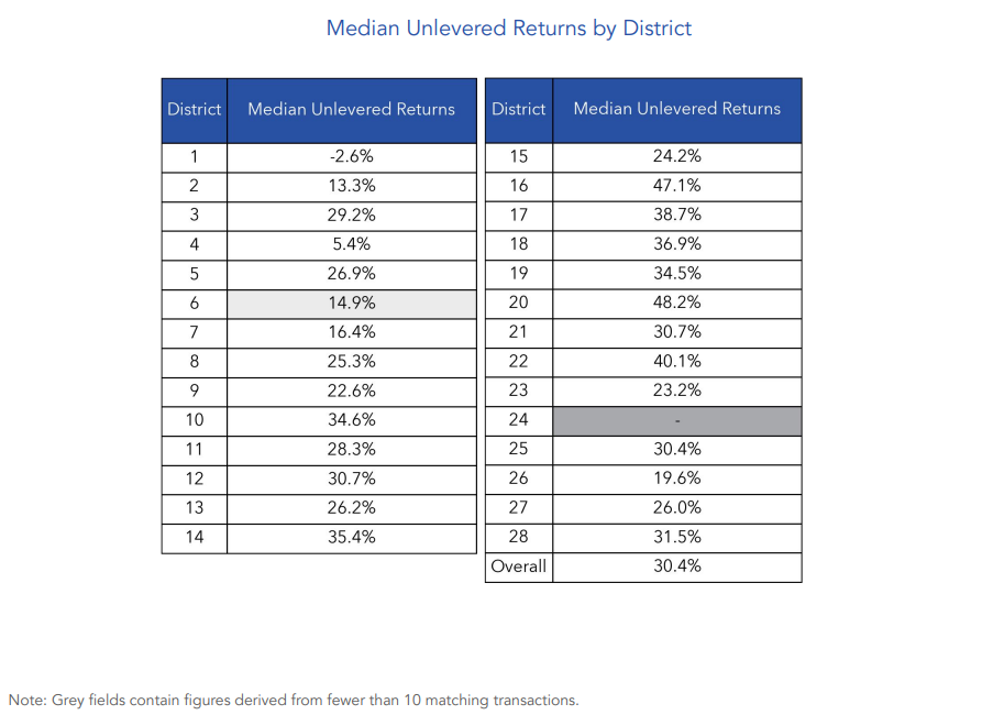 District 20, covering Ang Mo Kio, Bishan and Thomson, recorded the highest median unlevered return at 48.2%. Conversely, District 1 recorded a median unlevered return of –2.6%. This reflects a recurring theme in recent years, where suburban and city fringe districts often deliver more consistent capital appreciation compared to the more volatile prime core.
