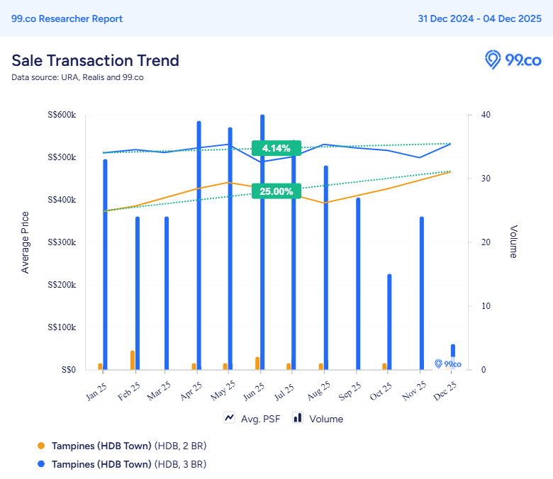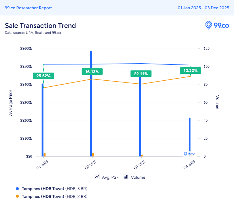 Meanwhile, 3-room flats averaged around S$514K during the same period. The gap is still clear indeed, but the broader trend shows a meaningful shift: the difference between 2-room and 3-room prices in Tampines has tightened noticeably compared to the last quarter.