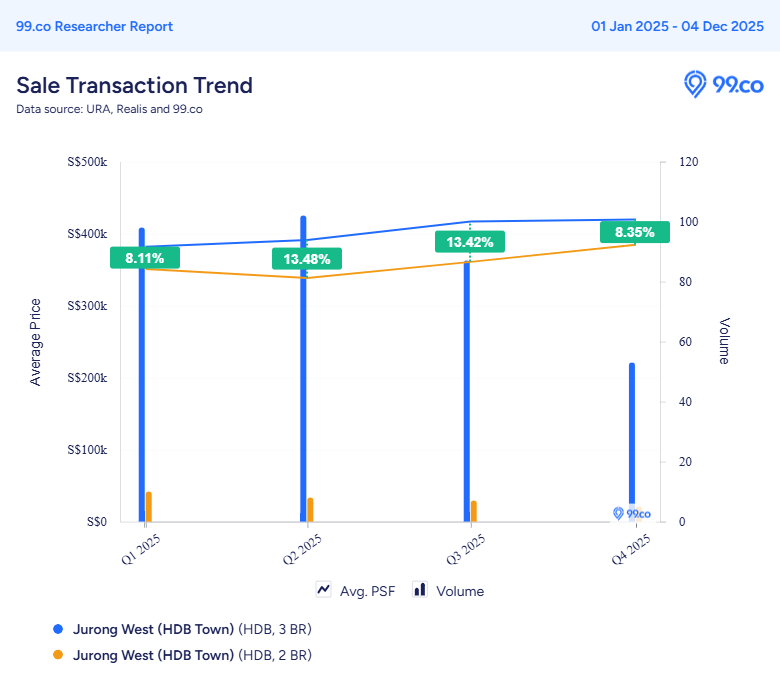 This shift creates a rare window of opportunity for buyers who are eyeing more space. With 3-room prices momentarily lagging behind, households that have been considering an upgrade may find it easier to secure a bigger flat without stretching their budget much further. At the time of writing, active listings on 99.co show 3-room flats in Jurong West starting from about S$320K.
