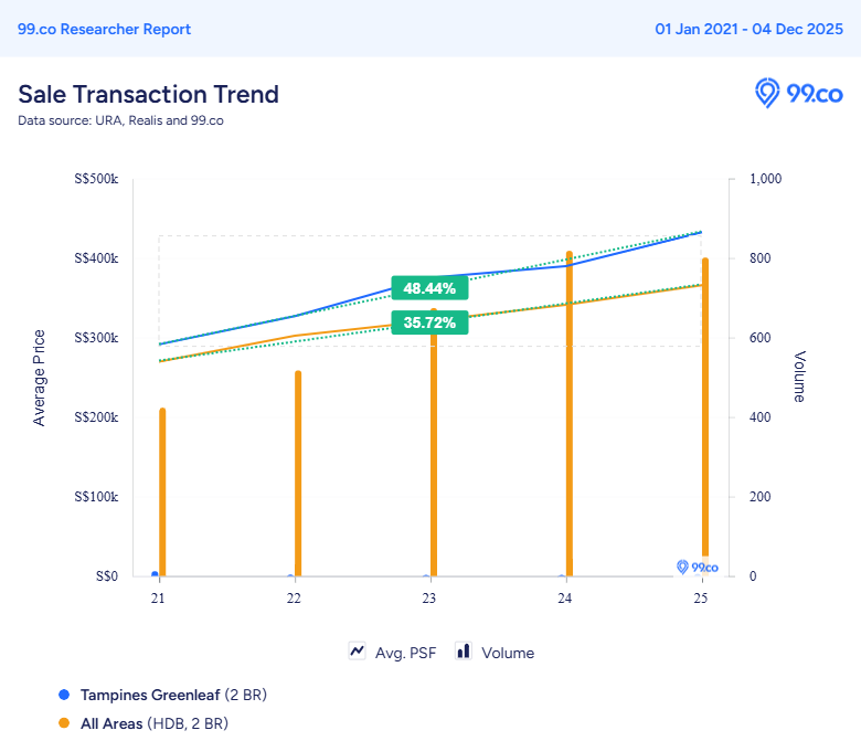 Since 2021, when the flats started to enter the resale market, average prices for 2-room units at Tampines Greenleaf have risen by 48.44%. In comparison, the nationwide growth rate for this flat type over the same period is 35.72%.