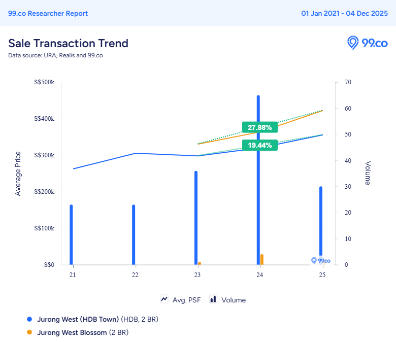 Since the first 2-room flat at Jurong West Blossom entered the resale market in 2023, average prices for this unit type have risen by almost 28%. In comparison, similar 2-room flats across Jurong West appreciated by only about 19% over the same period.