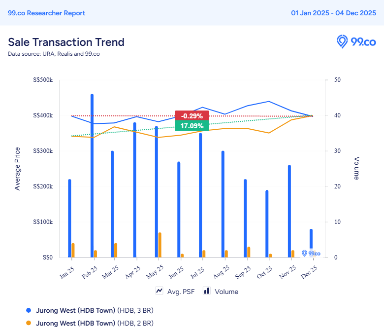 Since January 2025, 2-room resale prices in Jurong West have risen by about 17%. In contrast, 3-room prices have slipped slightly by around 0.3%. These diverging movements have technically closed the price gap between the two segments by December.
