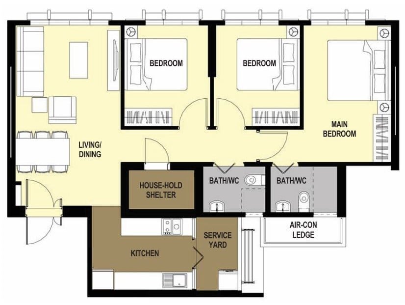 Measuring 1,044 sqft, the 4-room flat features an en-suite master bedroom, two additional bedrooms, a common bathroom, and a spacious living/dining area. The kitchen links to a service yard, which offers added utility for households with regular laundry needs.