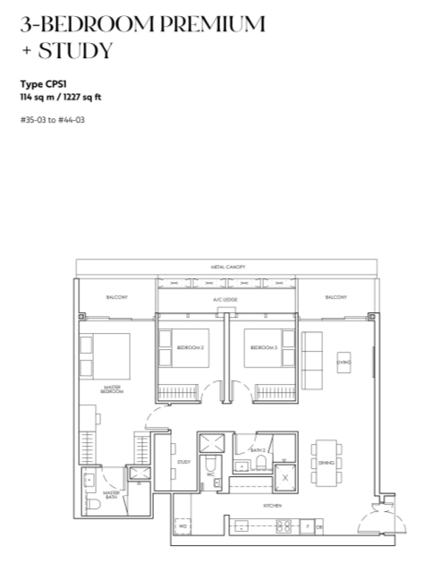 For 3-bedroom buyers, three layouts are available for Newport Residences: a standard configuration, one with a store room, and one with a study. The study variant, Type CPS1, is the largest at 1,227 sqft and also arguably the most efficient.