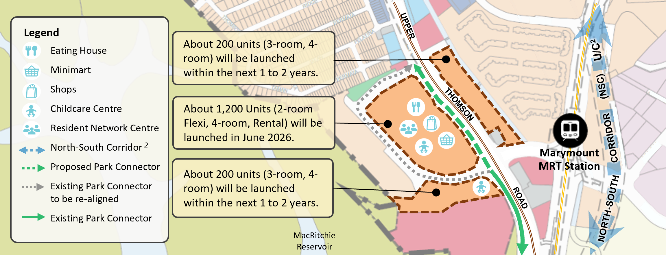 Meanwhile, the existing park connector along Upper Thomson Road will be adjusted to provide easier access to MacRitchie Reservoir, supporting walking, cycling, and outdoor recreation.