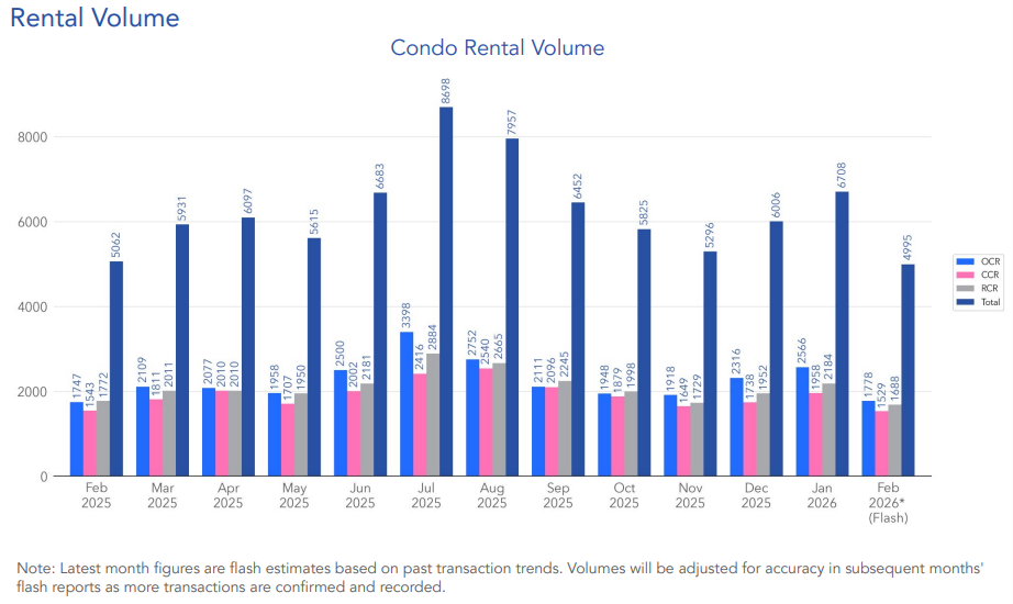 Compared with the same month last year, condo rental transactions were 1.3% lower than in February 2025, suggesting that overall leasing demand remains broadly similar to last year but may fluctuate month-to-month due to seasonal factors.