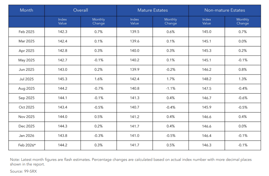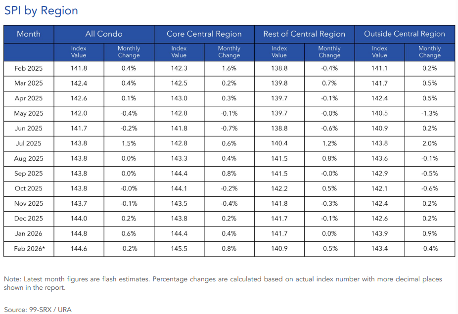 Condominium rental prices edged down slightly in February 2026, with the 99-SRX Condo Rental Price Index declining 0.2% month-on-month, easing from 144.8 in January to 144.6 in February. With softer leasing activity typically observed during the festive season, rental negotiations may lean slightly more in favour of tenants, leading to marginal adjustments in price levels.