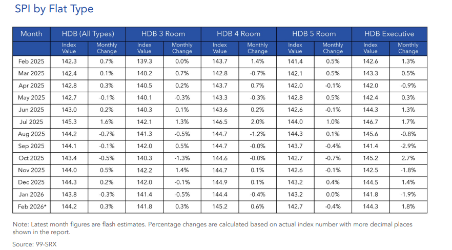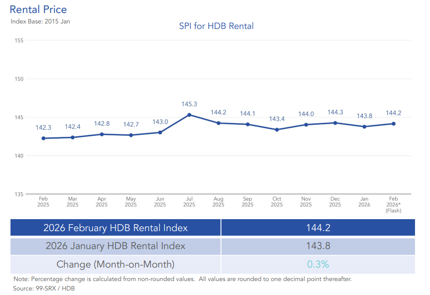 The HDB Rental Price Index rose 0.3% month-on-month, increasing from 143.8 in January to 144.2 in February 2026.
