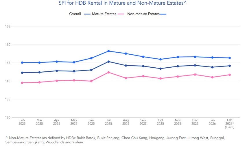 On an annual basis, HDB rental prices also continued to trend upward. Overall rental prices were 1.3% higher than in February 2025, reflecting continued demand in the public housing rental market.