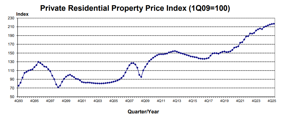 According to URA flash estimates, overall private residential prices rose by 0.3% quarter-on-quarter in Q1 2026. This marks a slowdown from the 0.6% growth recorded in the previous quarter and represents the softest increase in six quarters.