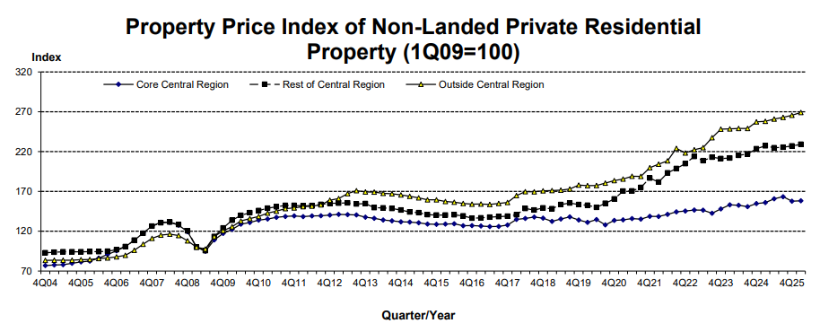 Across regions, the Outside Central Region (OCR) recorded the strongest growth at 1.3% quarter-on-quarter, extending its momentum from the previous quarter. The Rest of Central Region (RCR) followed with a 0.9% increase, while the Core Central Region (CCR) posted a modest 0.4% gain, rebounding from its earlier decline.