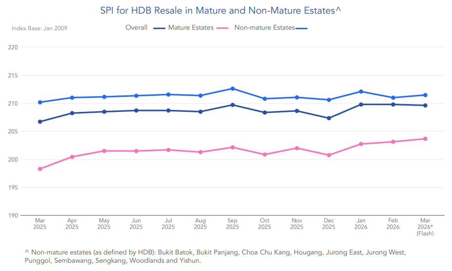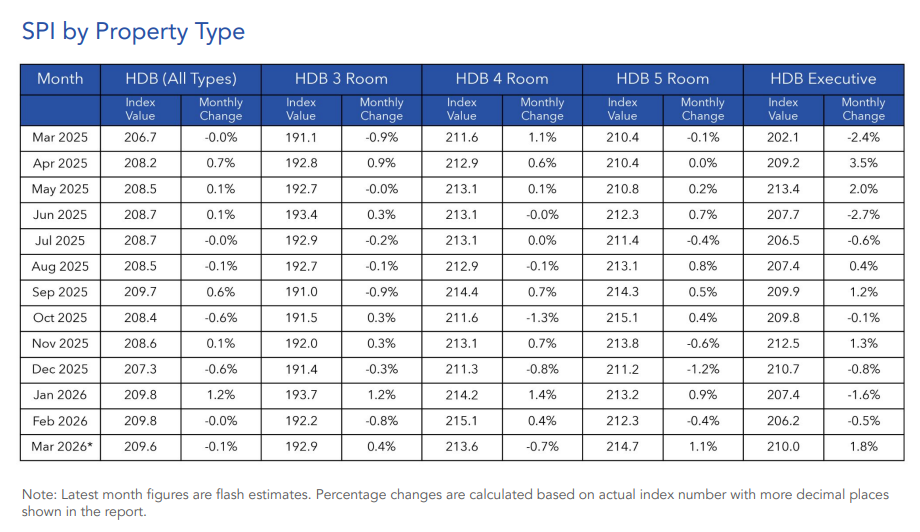 In months where a larger share of transactions comes from relatively lower-priced segments, such as certain 4-room flats, the overall index can be pulled down despite stable or rising prices elsewhere.