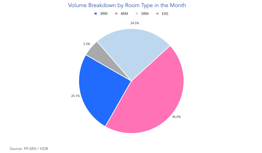 The distribution of transactions by flat type provides further insight into buyer behaviour. 4-room flats continued to dominate, accounting for 45% of total resale volume, reflecting their position as the most popular option for many households.