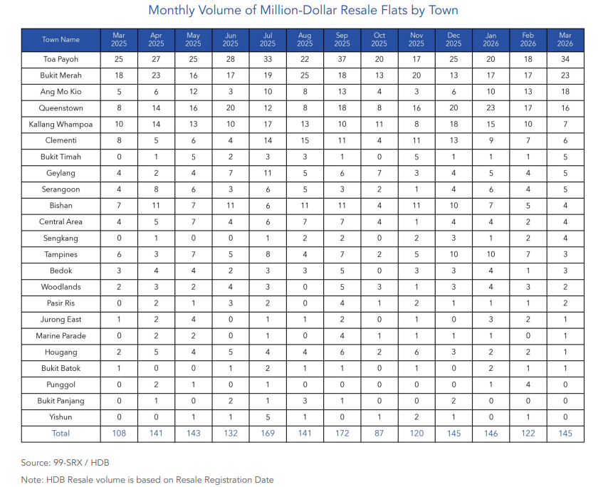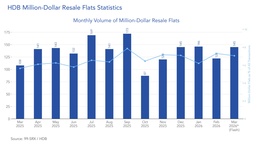 Another key highlight from March is the continued increase in million-dollar transactions. A total of 145 flats were sold for at least S$1 million, up from 122 in the previous month. According to Mr Luqman, the increase in high-value transactions reflects sustained interest in well-located and larger units, which continue to attract buyers despite broader market moderation. Notably, these high-value deals represented 7.1% of total resale volume in March.