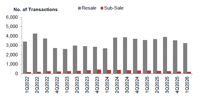 There were 3,225 resale transactions in the quarter, slightly lower than the 3,529 units recorded in Q4 2025. Despite the dip in absolute numbers, resale deals made up a larger proportion of the market, accounting for 59.6% of all transactions, up from 52.7% in the previous quarter.