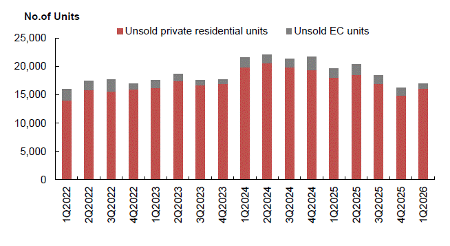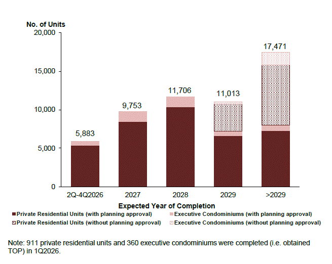 A total of 1,271 private residential units (including ECs) were completed in Q1 2026, adding to the existing housing stock. On the upcoming supply, as of the end of Q1 2026, there were 42,561 units (including ECs) with planning approval, of which 17,032 units remained unsold.