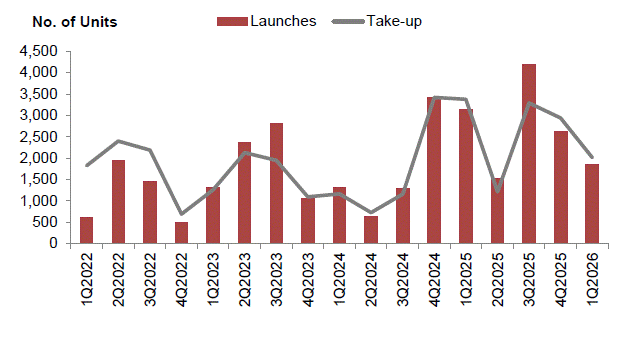 Developer activity slowed in Q1 2026, with both launches and sales easing from the previous quarter. Developers sold 2,013 private residential units (excluding ECs), marking a 32% quarter-on-quarter decline from the 2,940 units transacted in Q4 2025. On the supply side, a total of 1,844 new units were launched, down from 2,632 units previously.